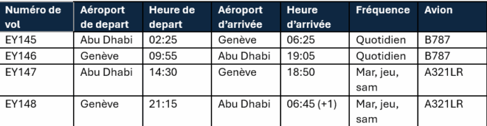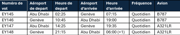 Le vol du soir décolle de Genève à 21h15 les mardis, jeudis et samedis, arrivant à Abu Dhabi à 06h45 le lendemain. Le vol d’après-midi correspondant décolle d’Abu Dhabi à 14h30 les mêmes jours, atterrissant à Genève à 18h50. Combiné à la rotation quotidienne matinale en Boeing 787, cet horaire améliore la connectivité via Abu Dhabi, avec un accès à des destinations telles que Bangkok, Phuket, Kuala Lumpur, Séoul, les Maldives, Colombo, Jakarta, Manille, Mascate et les principales villes indiennes.